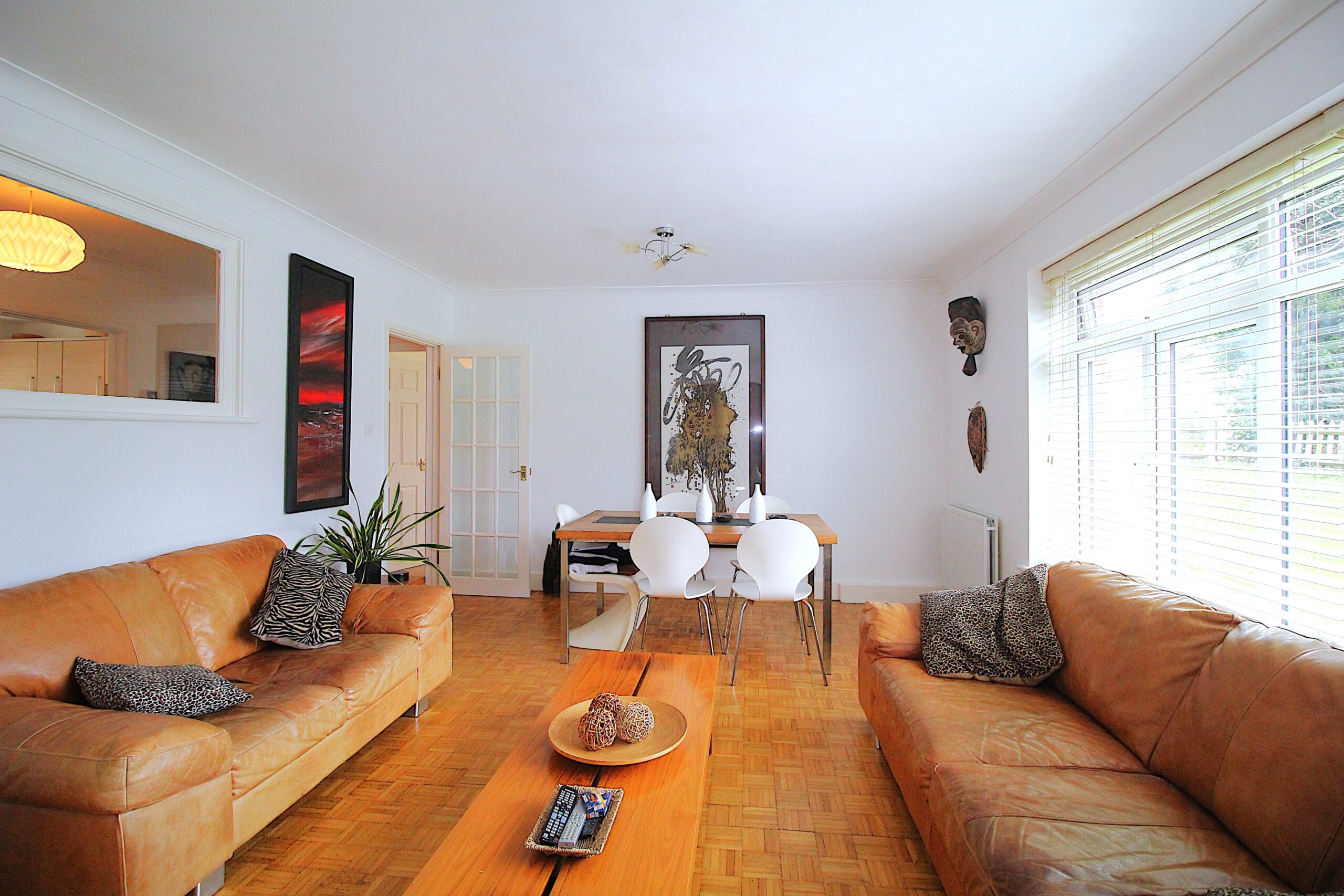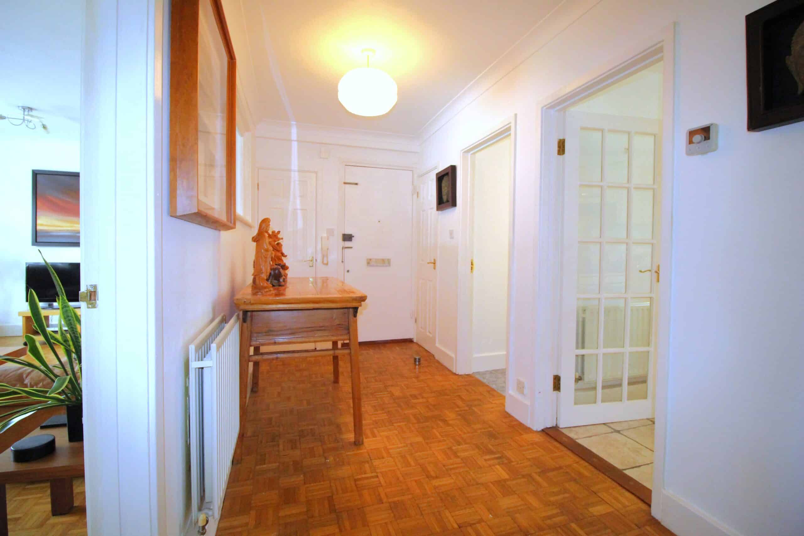 The spacious accommodation measuring 900 sq ft is light and airy throughout and comprises a welcoming entrance hall with parquet flooring which is a theme to all principle rooms, spacious reception / dining room overlooking the front gardens, fitted kitchen with integrated appliance and breakfast bar, two large double bedrooms with the master bedroom having built in wardrobes, spacious bathroom with shower cubicle and bath and ample storage cupboards.